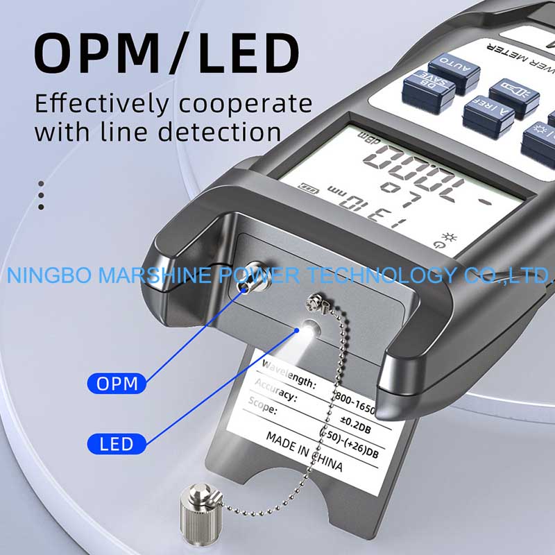 Nossa ferramenta de solução de problemas de fibra óptica MARSHINE Power Meter OPM Tester (OPM Tester) é um equipamento de teste de alto desempenho que é aplicável para medir o nível de potência do sinal óptico em sistema de fibra óptica. Ele oferece resultados confiáveis e precisos, que podem ser utilizados com eficácia pelos técnicos na verificação da intensidade do sinal, isolamento de falhas e avaliação de desempenho de sistemas de fibra. O tamanho pequeno e a operação simples o tornam adequado para trabalho de campo, engenheiros de rede, equipe de manutenção em ambientes de telecomunicações, data center e sistemas CATV.