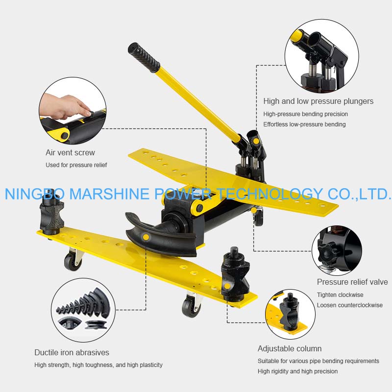 Este equipamento de dobra de tubos hidráulicos tipo manual MARSHINE SWG permite uma variedade de matrizes de dobra para vários diâmetros de tubos usados em construção e trabalhos elétricos, etc.